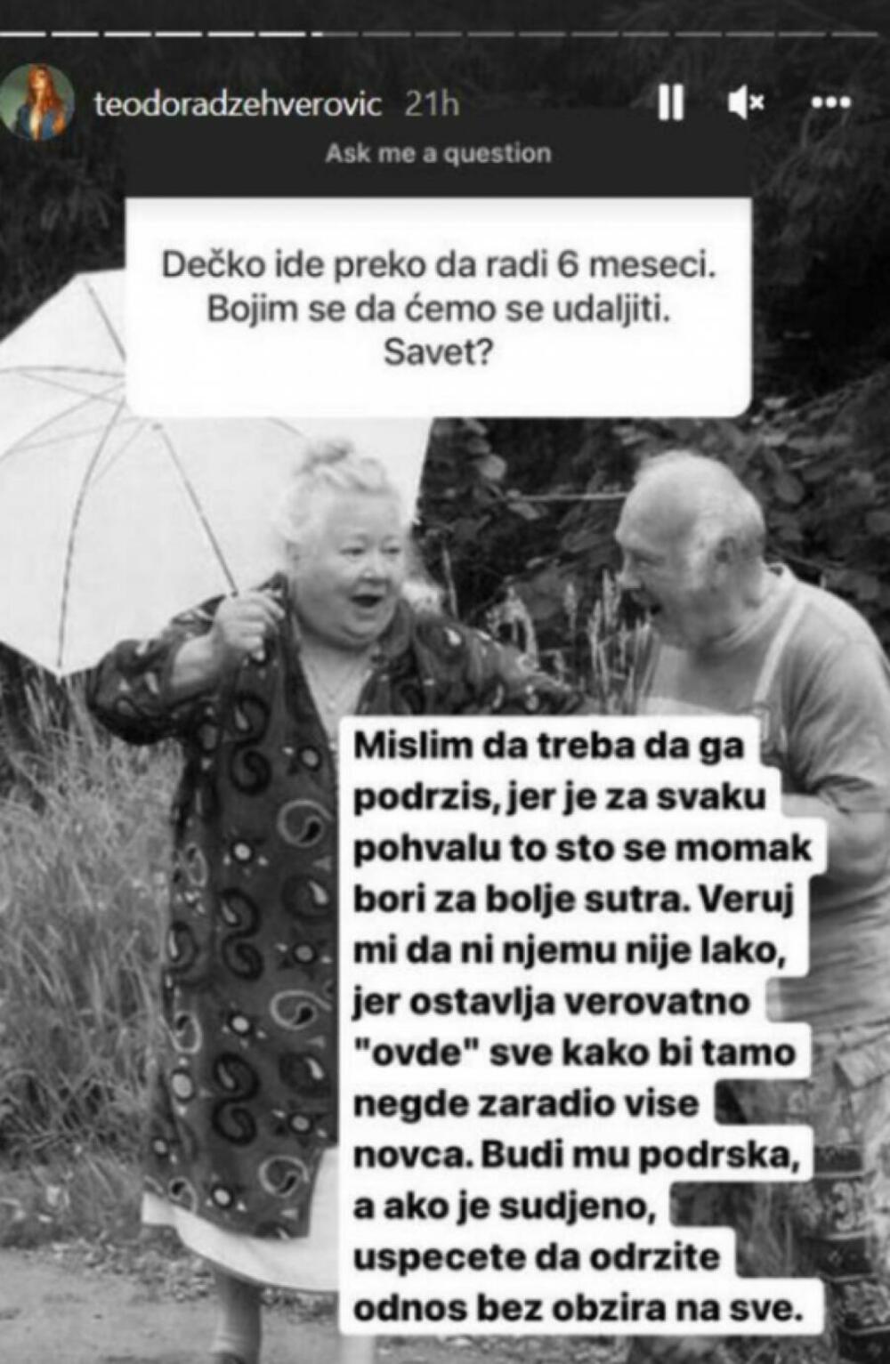 - Dečko ide van zemlje da radi šest meseci. Bojim se da ćemo se udaljiti. Treba mi savet - bilo je pitanje koje je privuklo najviše pažnje budući da Teodora već neko vreme uživa u ljubavi sa košarkašem Ninom sa kojim nema priliku da provodi svaki dan zbog prirode njegovog posla.