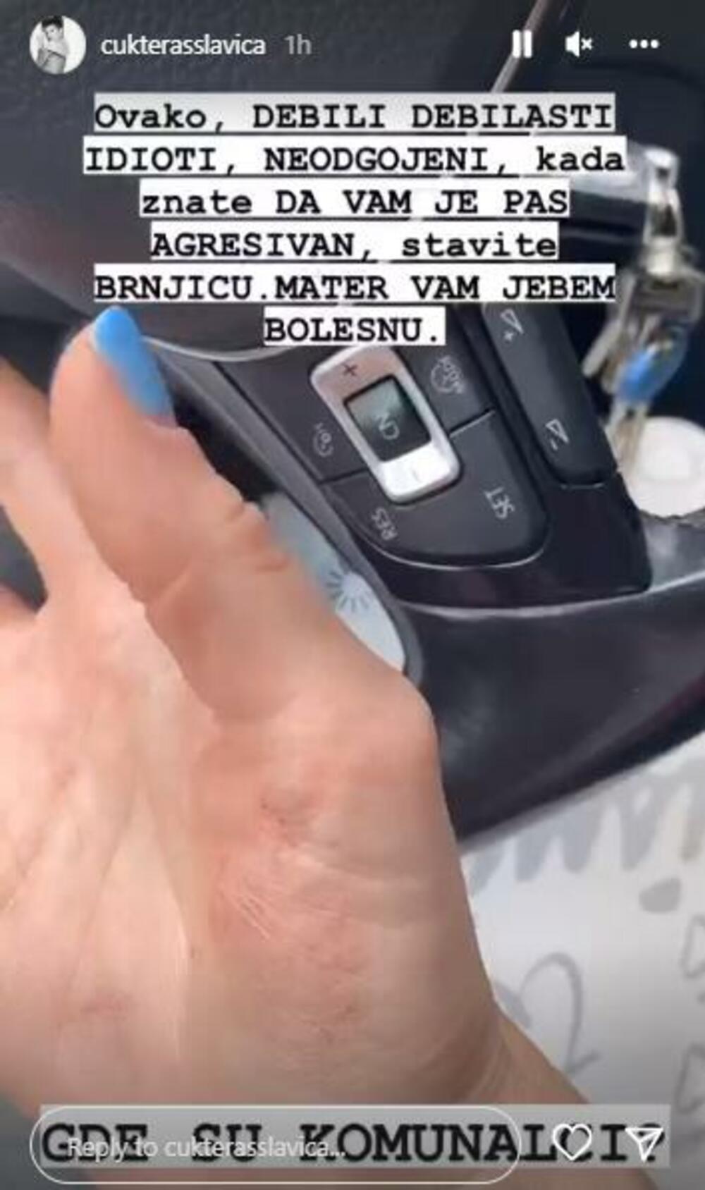 - Ovako, debili debilasti idioti, neodgojeni, kada znate da vam je pas agresivan, stavite brnjicu. Mater vam je*** - napisala je Slavica na svom Instagram profilu, a onda se zapitala: