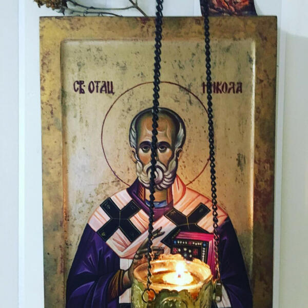 Dragana Katić i njeni sinovi slave Svetog Nikolu, o čemu svedoče ikona i kandilo na zidu.