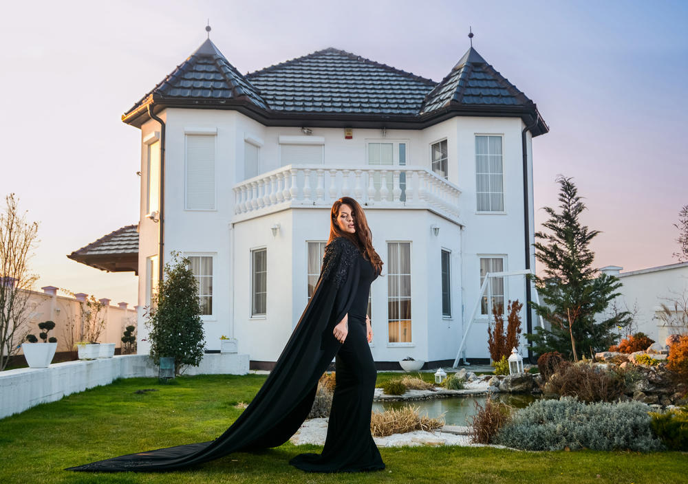 Pevačica je obukla crnu dugu haljinu, uz koju ima i prelep plašt, a onda se slikala ispred kuće.