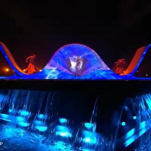 Vladana, sa možda najneobičnijim kostimom ove godine – plavom haljinom sa svetlucavim grudnjakom i ogromnim LED diskom na leđima. Kako se pesma gradi, svetla postaju svetlija i snažnija.