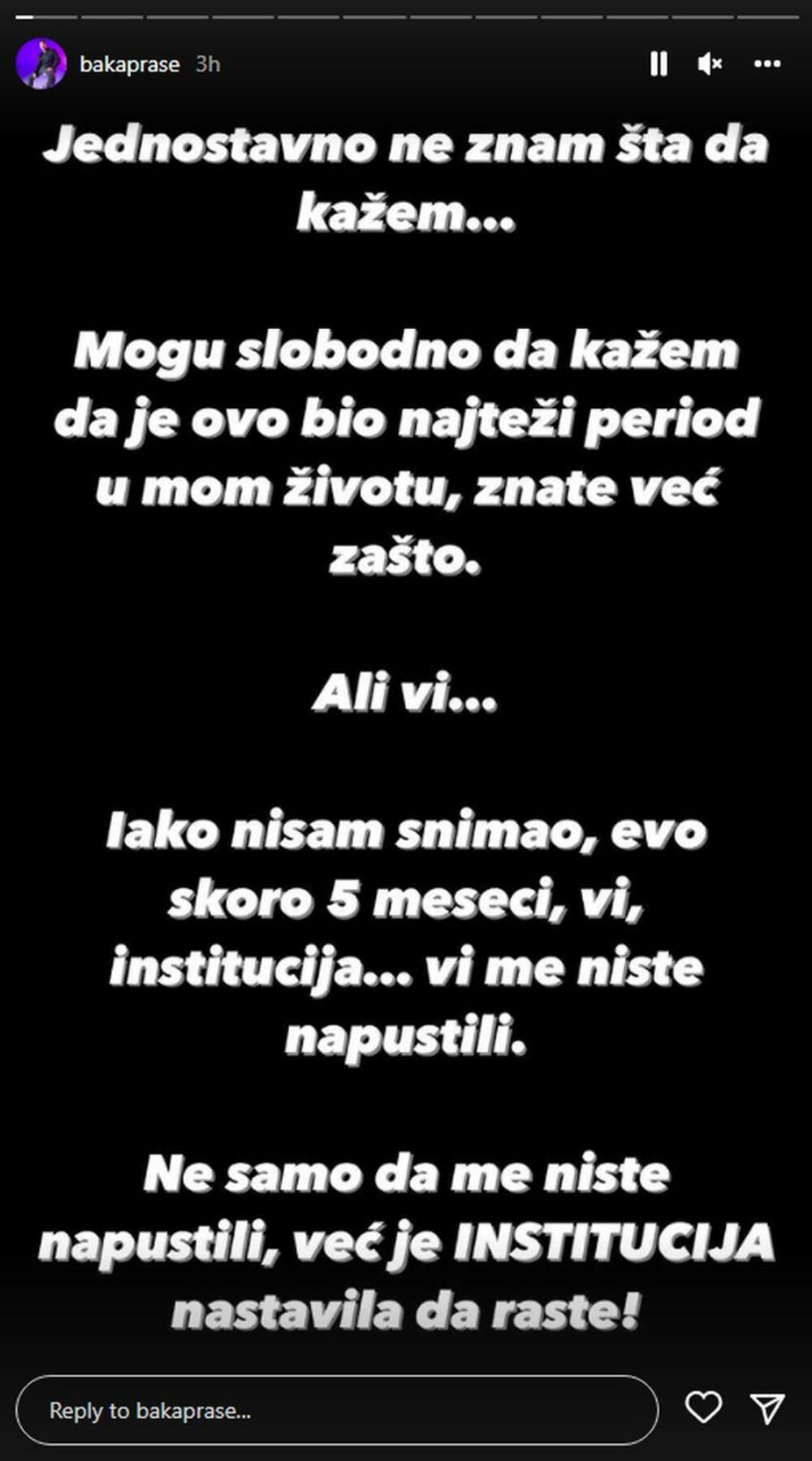 - Jednostavno ne znam šta da kažem... Mogu slobodno da kažem da je ovo bio najteži period u mom životu, znate već zašto. Ali vi... Iako nisam snimao, evo skoro 5 meseci, vi, institucija... vi me niste napustili. Ne samo da me niste napustili, nego je institucija nastavila da raste.