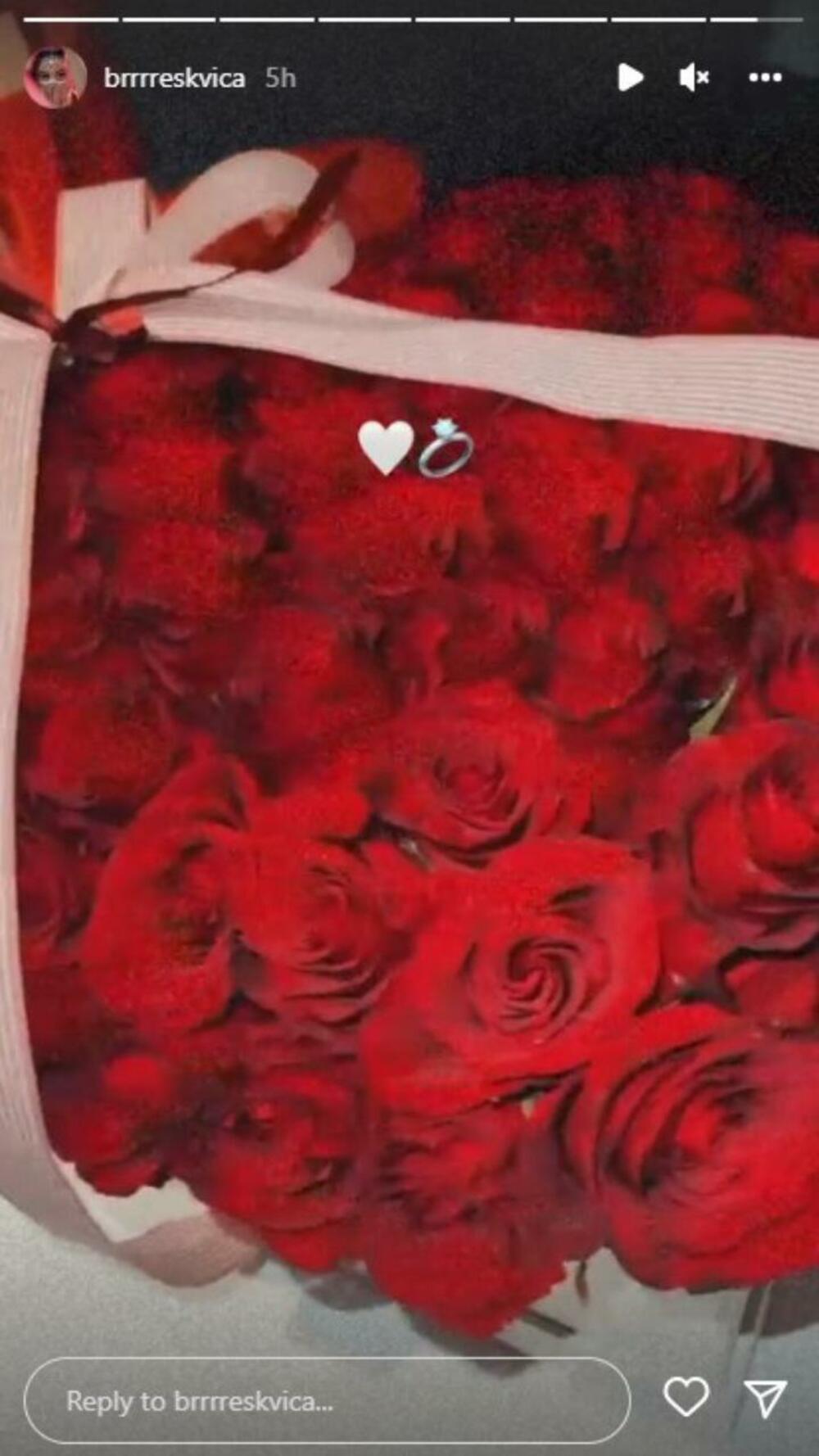 Tako, najnoviji znak kojim je zaintrigirala fanove i izazvala sumnje da je vezu podigla na viši nivo je objava na Instagram storiju, gde je postavila sliku ogromnog buketa crvenih ruža sa mašnom, dok je u opisu ostavila emotikone srca, ali i vereničkog prstena.