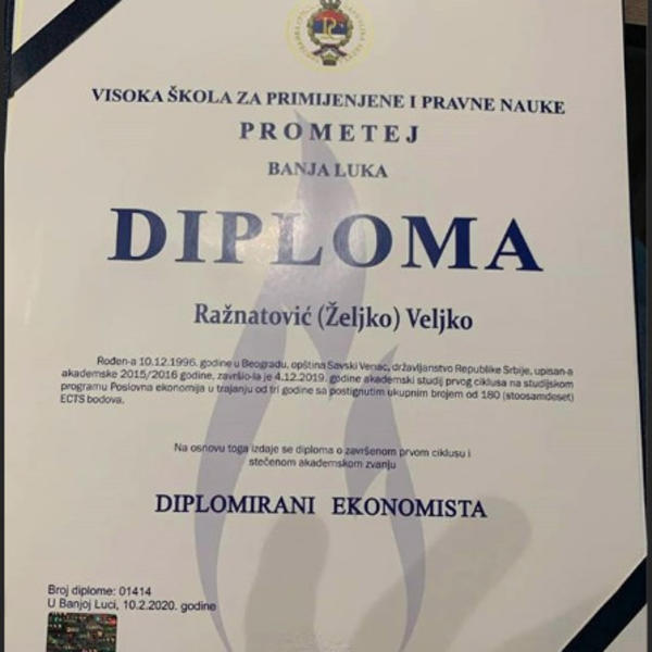Takođe, vidi se i podatak da je Veljko završio studijski program Poslovna ekonomija. Diplomirao je 4. decembra 2019. godine, a 10. februara je dobio diplomu.