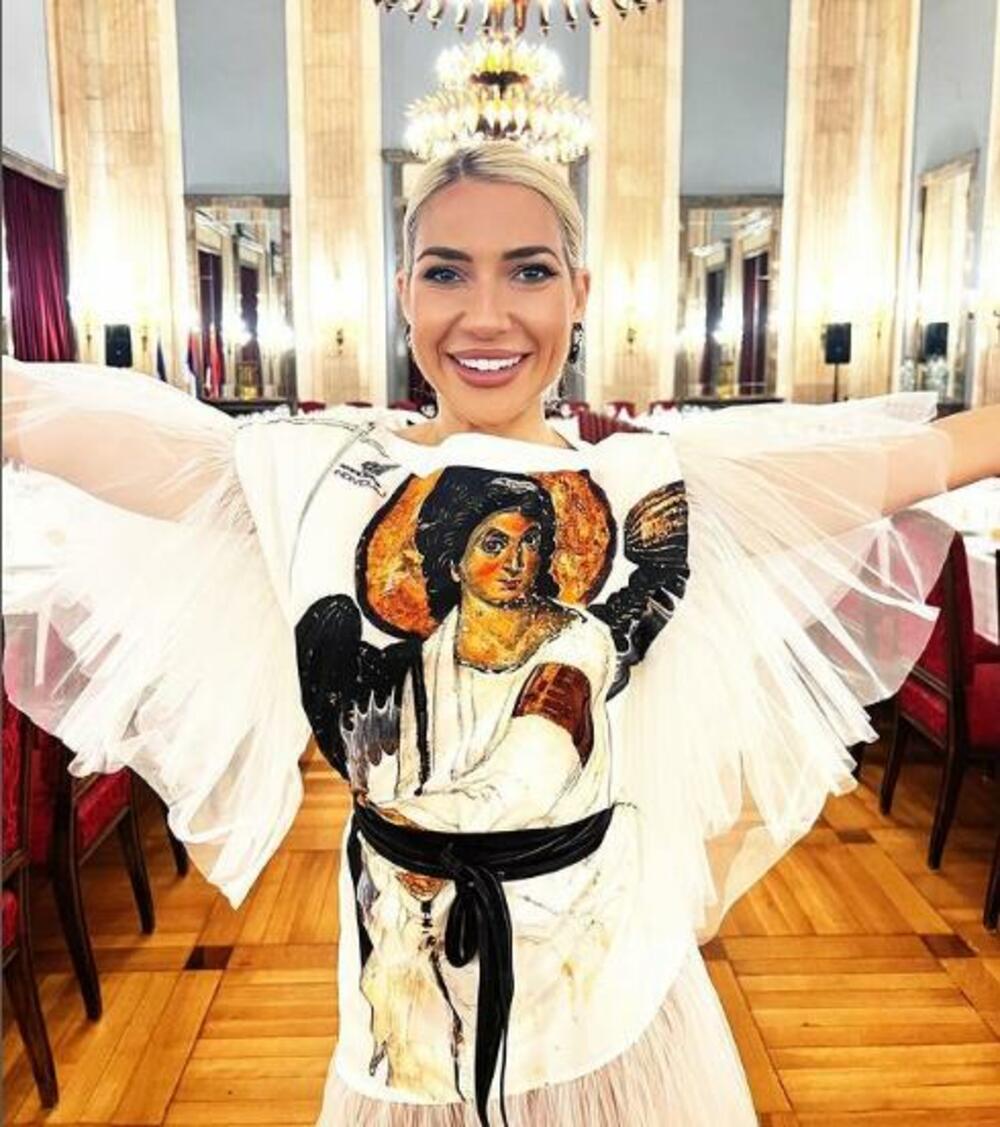 Jeremićeva se, naime, obukla sva u belo, dok je na grudima imala naslikanog Belog anđela, a na rukama karnere koji podsećaju na krila. Raširila je ruke i sa osmehom pozirala.