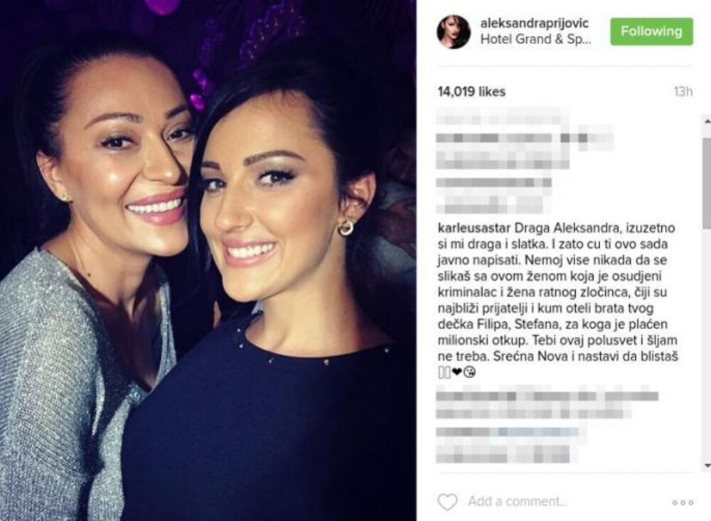- Draga Aleksandra, izuzetno si mi draga i slatka. I zato ću ti ovo sada javno napisati. Nemoj više nikada da se slikaš sa ovom ženom koja je osuđeni kriminalac i žena ratnog zločinca, čiji su najbliži prijatelji i kum oteli brata tvog dečka Filipa, Stefana, za koga je plaćen milionski otkup. Tebi ovaj polusvet i šljam ne treba. Srećna Nova i nastavi da blistaš.