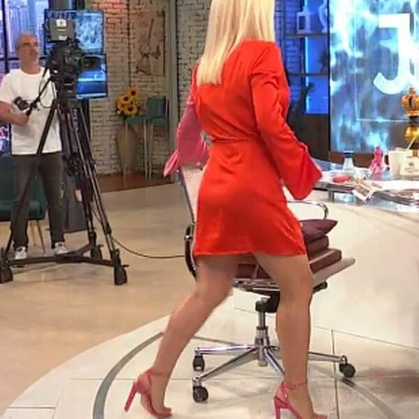 Haljina je imala duboki dekolte i široke rukave, zbog čega je voditeljka malo-malo morala da je povlači na gore, ali opet vodeći računa da "ne sevne" dok seda na stolicu.