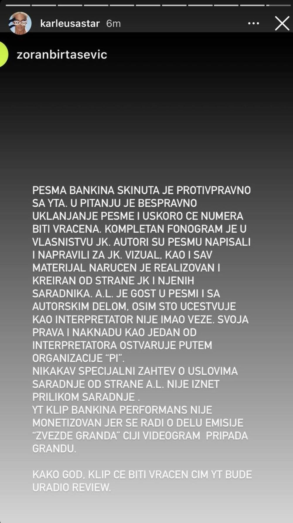 - Pesma "Bankina" skinuta je protivpravno sa Jutjuba. U pitanju je bespravno uklanjanje pesme i uskoro će numera biti vraćena. Kompletan fonogram je u vlasništvu JK. Autori su pesmu napisali i napravili za JK. Vizual, kao i sav materijal naručen je, realizovan i kreiran od strane JK i njenih saradnika - napisao je Zoran i dodao:
