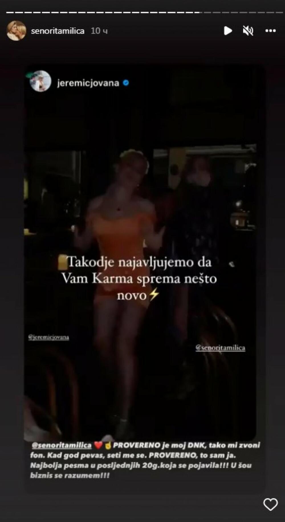 - Provereno je moj DNK, tako mi zvoni telefon. Kad god pevaš, seti me se. Provereno, to sam ja. Najbolja pesma u poslednjih 20 godina koja se pojavila. U šou biznis se razumem! - napisala je jovana u opisu Instagram storija koji je Milica Pavlović ripostovala.