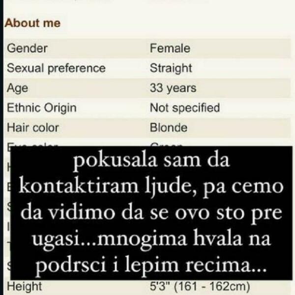 Pokušala sam da kontaktiram ljude, pa ćemo da vidimo da se ovo što pre ugasi. Mnogima hvala na podršci i lepim rečima", napisala je Milica i objavila "njen" oglas na spornom sajtu.
