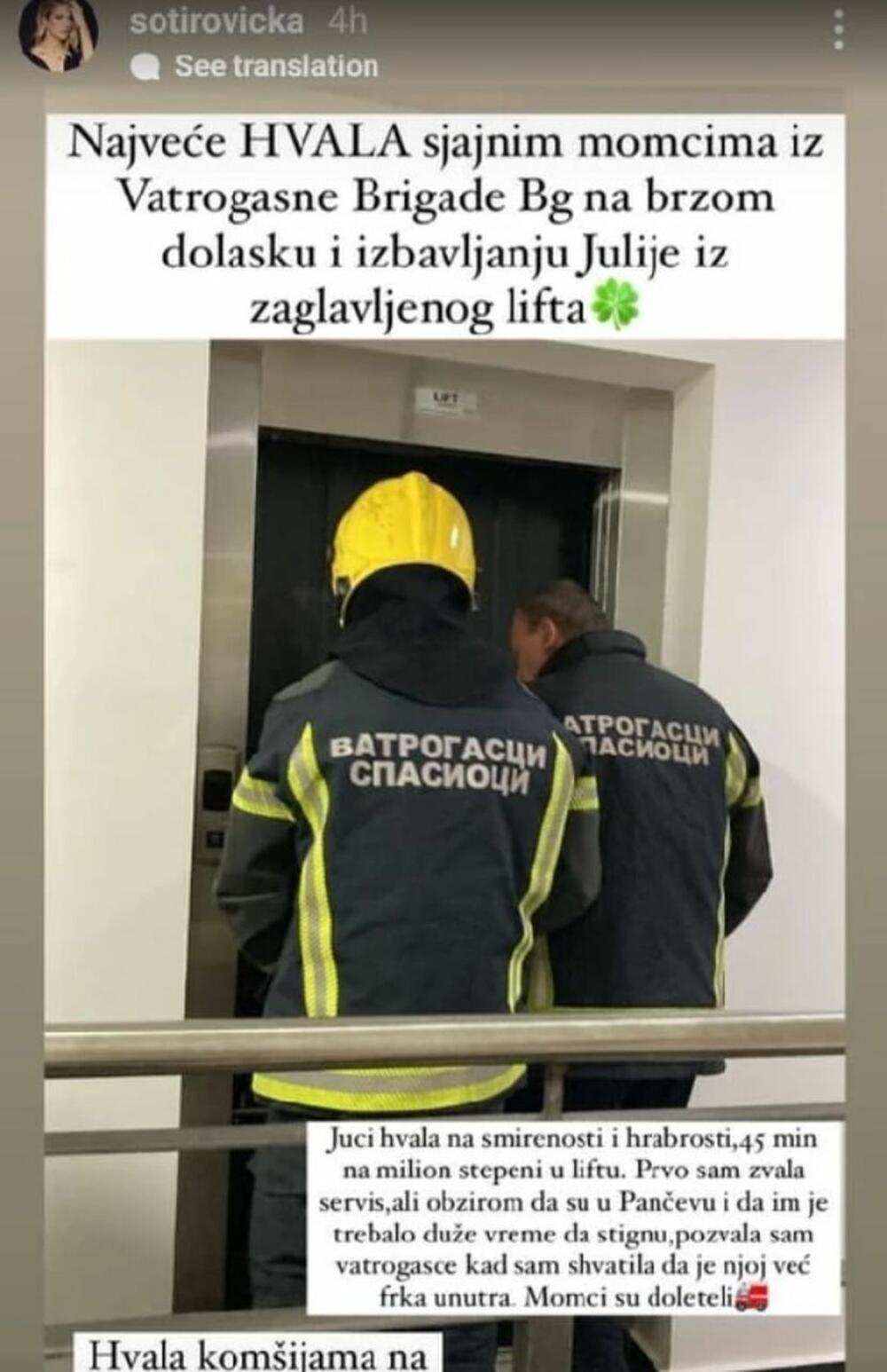 - Najveće hvala sjajnim momcima iz Vatrogasne brigade Beograd na brzom dolasku i izbavljivanju Julije iz zaglavljenog lifta! - napisala je Katarina Sotirović, čija ćerka ima 10 godina.