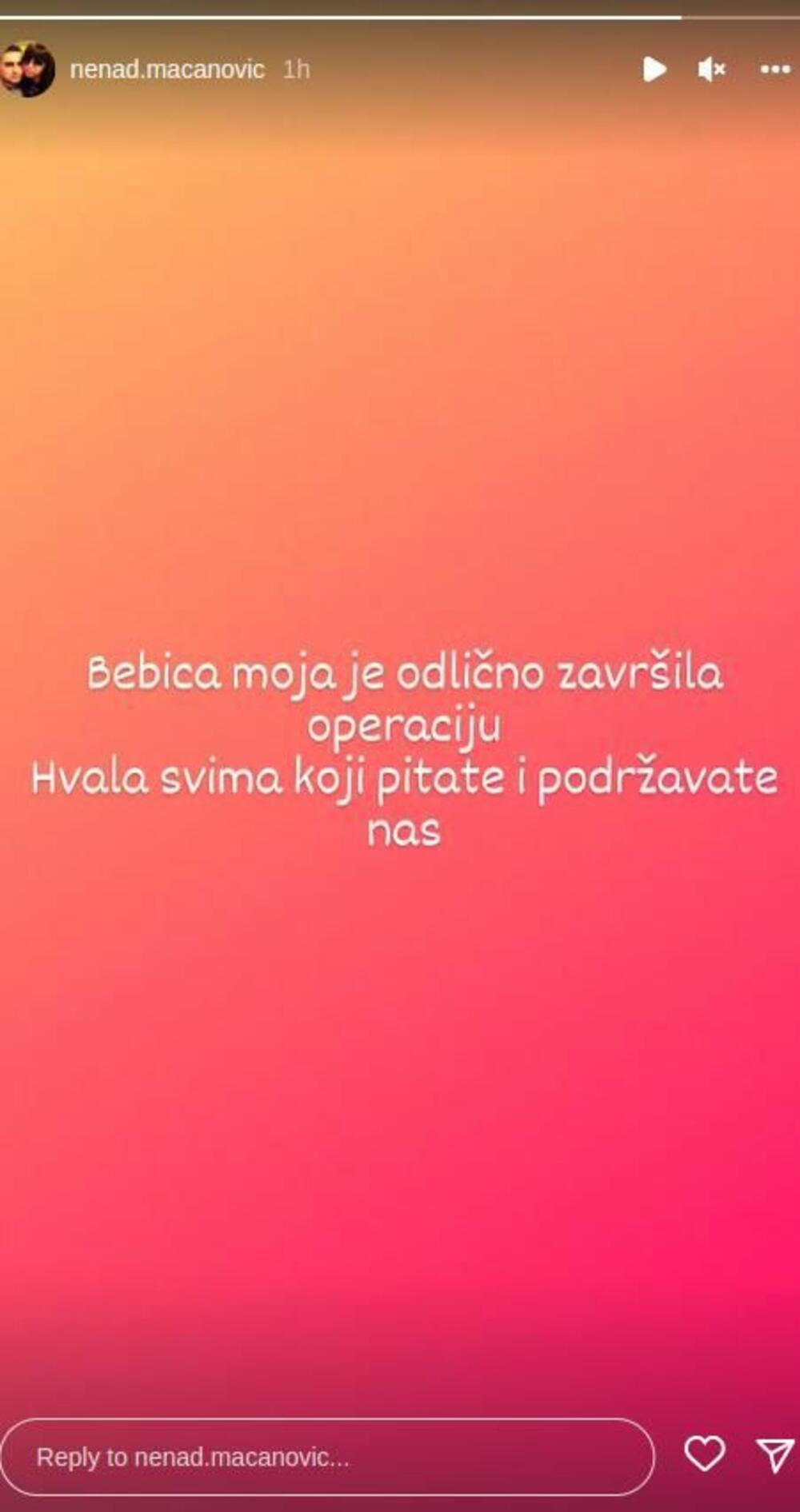 - Bebica moja je odlično završila operaciju. Hvala svima koji pitate i podržavate nas - napisao je Nenad na svom Instagramu.