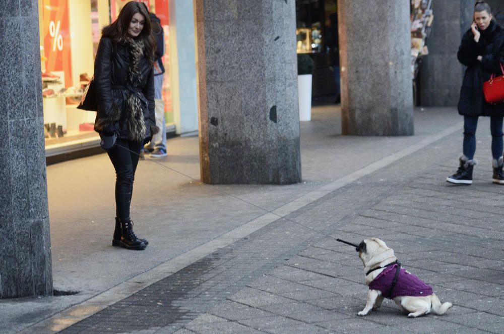 Voditeljka ga je na kraju uzela u ruke i krenula u razgledanje izloga, a posle nekog vremena i kučence se odobrovoljilo pa mu je bilo zanimljivo da trčkara i pomaže gazdarici u kupovini.