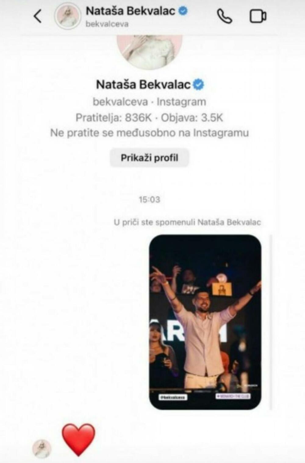 Pevačica je na svom storiju podelila fotografiju, a u poruci mu je poslala srce, čime se Marko odmah pohvalio. Prepisku s Natašom, Zorić je javno podelio