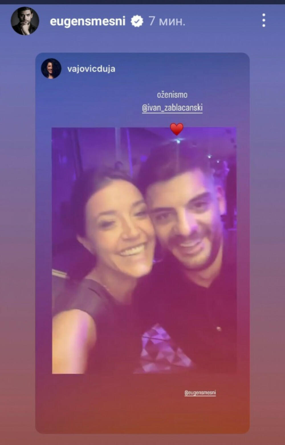 Poznati glumac koji važi za velikog zavodnika i šarmera kako na malim ekranim, tako i u privatnom životu, svojom nedavnom objavom na svom Instgram profilu je oduševio mnoge pripadnice lepšeg pola, kada je u društvu svoje koleginici, glumice Vaja Dujović zapevao i veselio se na svadbi prijatelja i kolege Ivana Zablaćanskog.