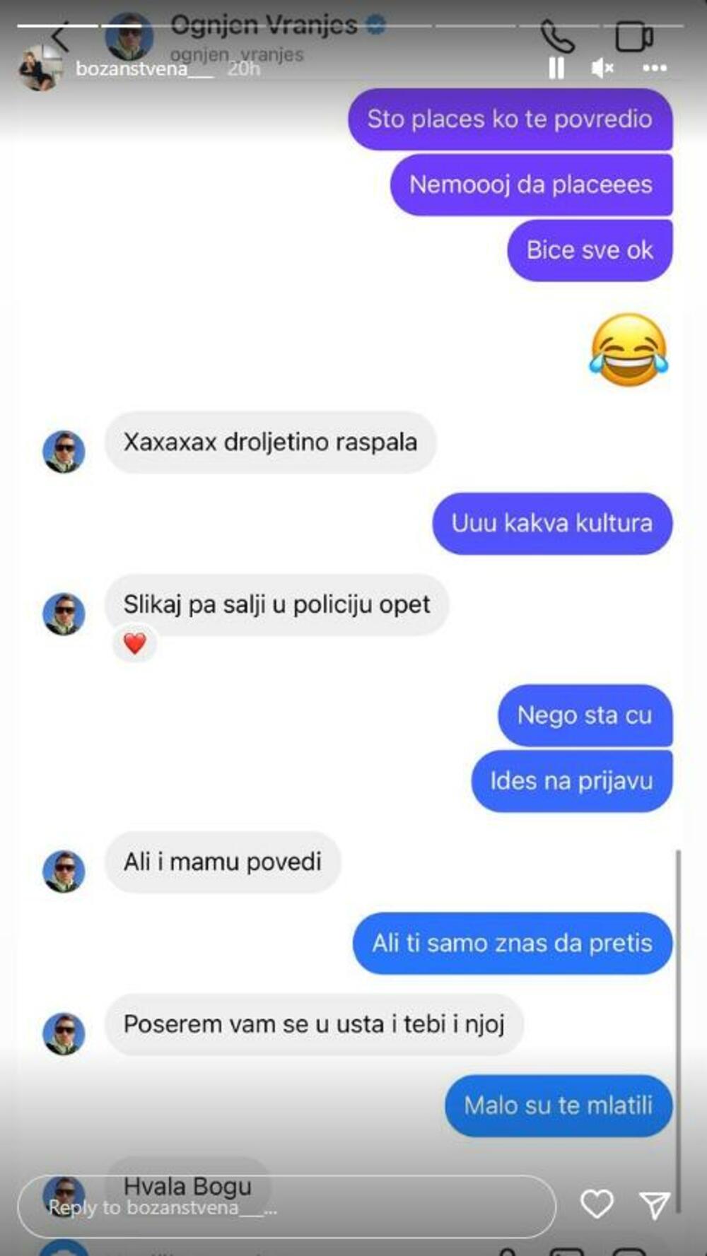 Naime, starleta je podelila Vranješevu fotografiju kako plače uz opis: ''Merkur ide retrogradno za dva dana'', zbog čega je fudbaler poludeo i u privatnoj prepisci počeo da je vređa i preti joj.