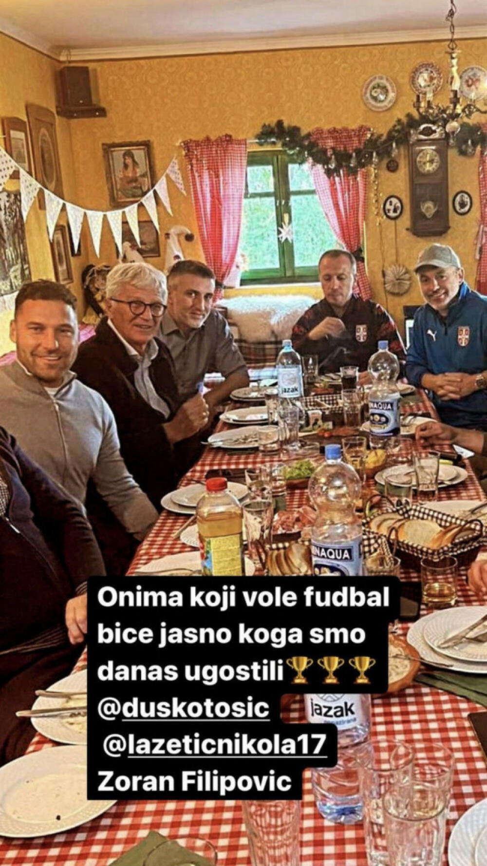 Svoju veliku ljubav nikako ne želi da zapostavi, a ujedno je spojio lepo i korisno te se na pretpostavljamo poslovnom ručku, okupio u jednoj kafani sa svojim prijateljima iz sveta fudbala. Dobrog raspoloženja Dušku očigledno ne manjka što se može videti na njegovom osmehom ozarenom licu, a sudeći po prepunom stolu dobre hrane i pića reklo bi se da se odlično provodi.