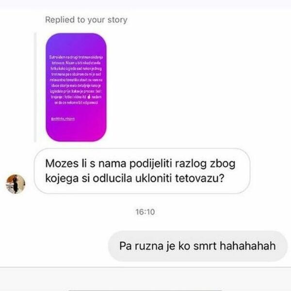 – Ovo je fotografija od danas ujutru. Kao što možete videti, jako puno je otišlo s jednim tretmanom tako da je vredelo boli, napisala je Ela uz fotku tetovaže, a jedna prijateljica ju je tada upitala koji je razlog da je odlučila ukloniti tetovažu.
