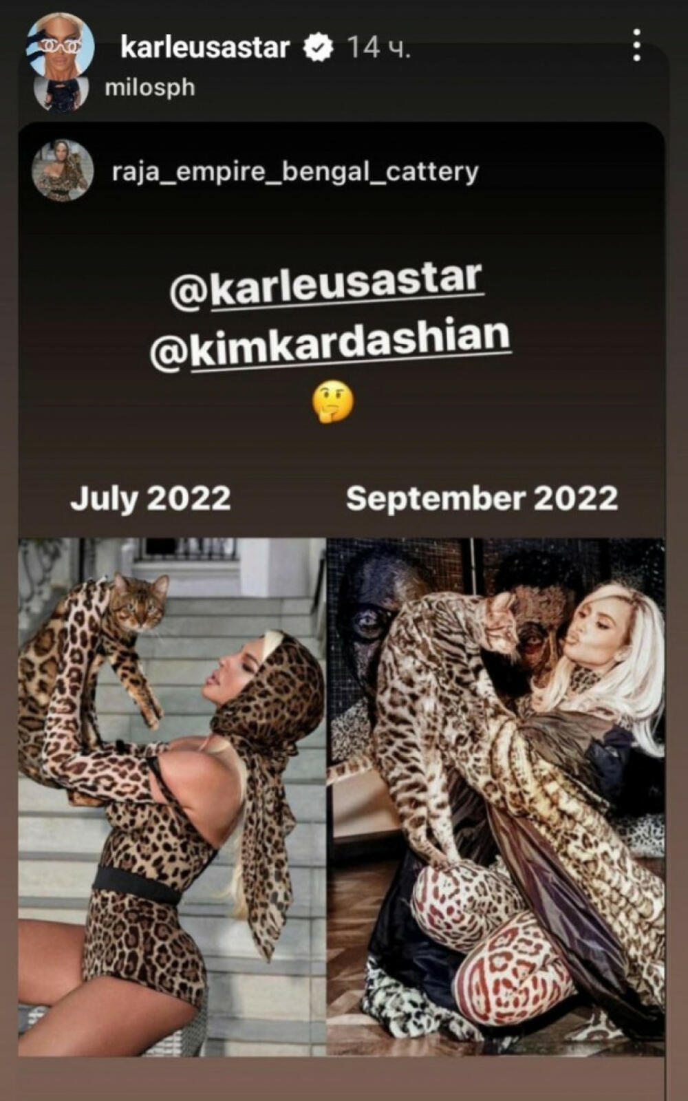 Dok je sa druge strane Jelena Karleuša objavila set fotografija odevena u triko koji ima isti dezen, sa marom na glavi dok u ruci drži divlju mačku.