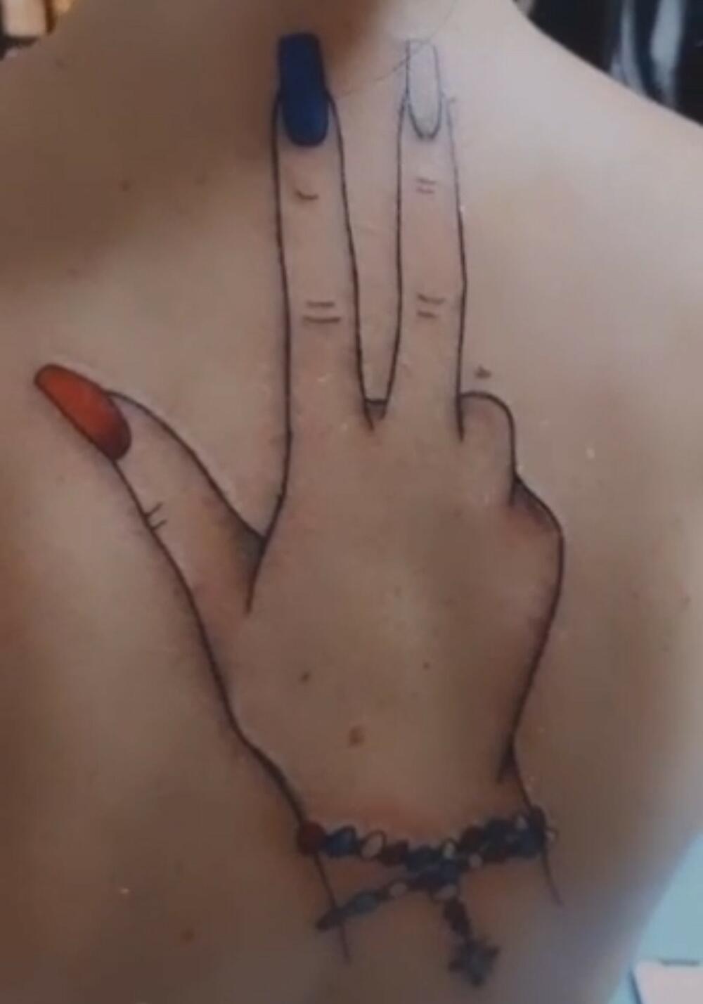 Naime, Elektra je na svojim leđima istetovirala ruku koja pokazuje tri prsta. Nokti su u bojama naše zastave, dok oko zgloba ima brojanicu.