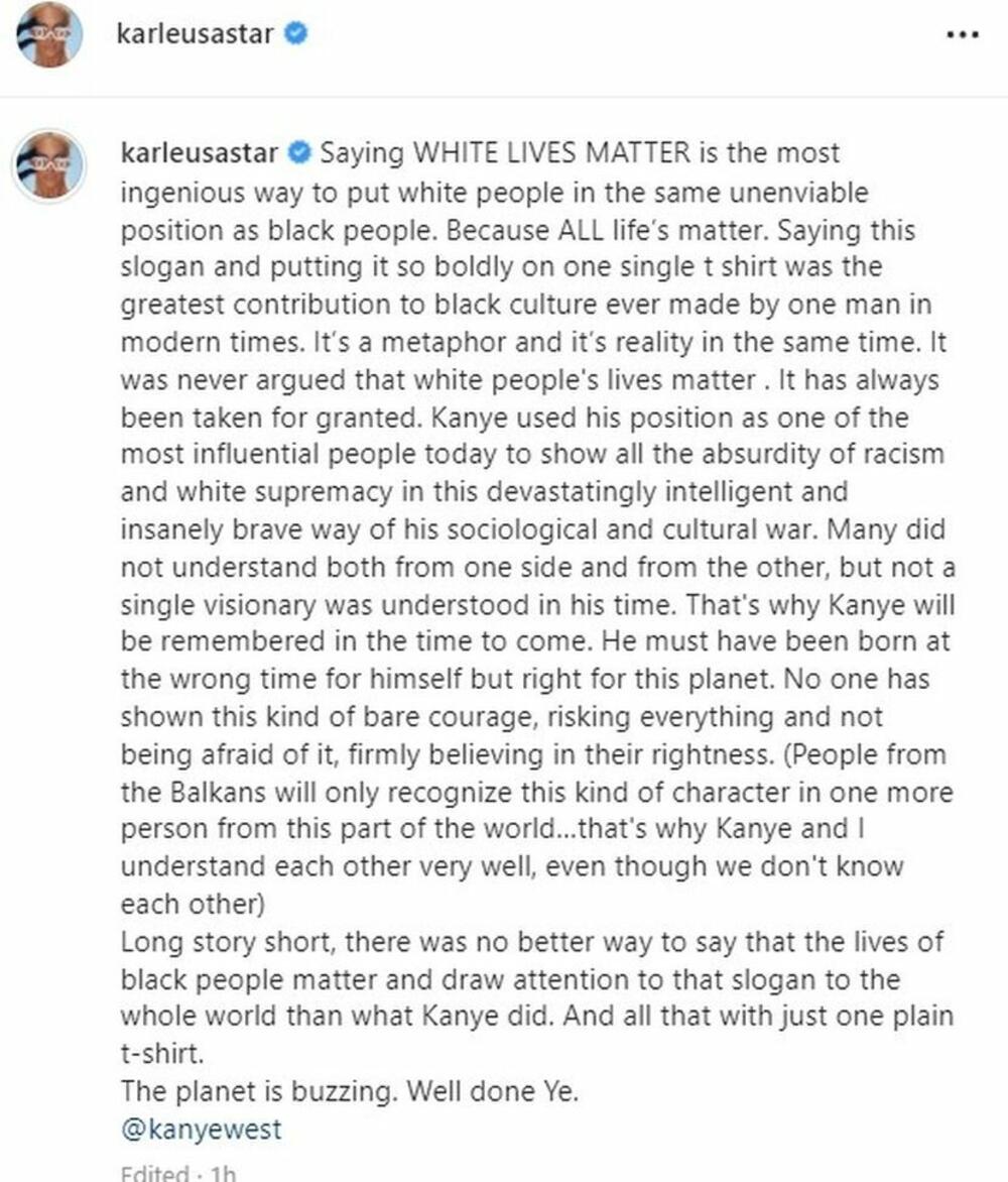 - Reći "Životi belaca su važni" je najgenijalniji način da se belci dovedu u isti nezavidan položaj kao i crnci. Jer SAV život je važan. Izgovaranje ovog slogana i tako hrabro stavljanje na jednu majicu bio je najveći doprinos crnačkoj kulturi koji je ikada dao jedan čovek u modernom vremenu. To je metafora i realnost u isto vreme. Nikada se nije tvrdilo da su životi belaca važni. Uvek se podrazumevalo. Kanje je iskoristio svoju poziciju jednog od najuticajnijih ljudi današnjice da pokaže svu apsurdnost rasizma i nadmoći belaca na ovom razorno inteligentnom i ludo hrabrom načinu svog sociološkog i kulturnog rata. Mnogi nisu razumeli i s jedne i s druge strane, ali ni jedan vizionar nije bio shvaćen u svoje vreme - piše u Jeleninoj objavi i dalje se navodi: