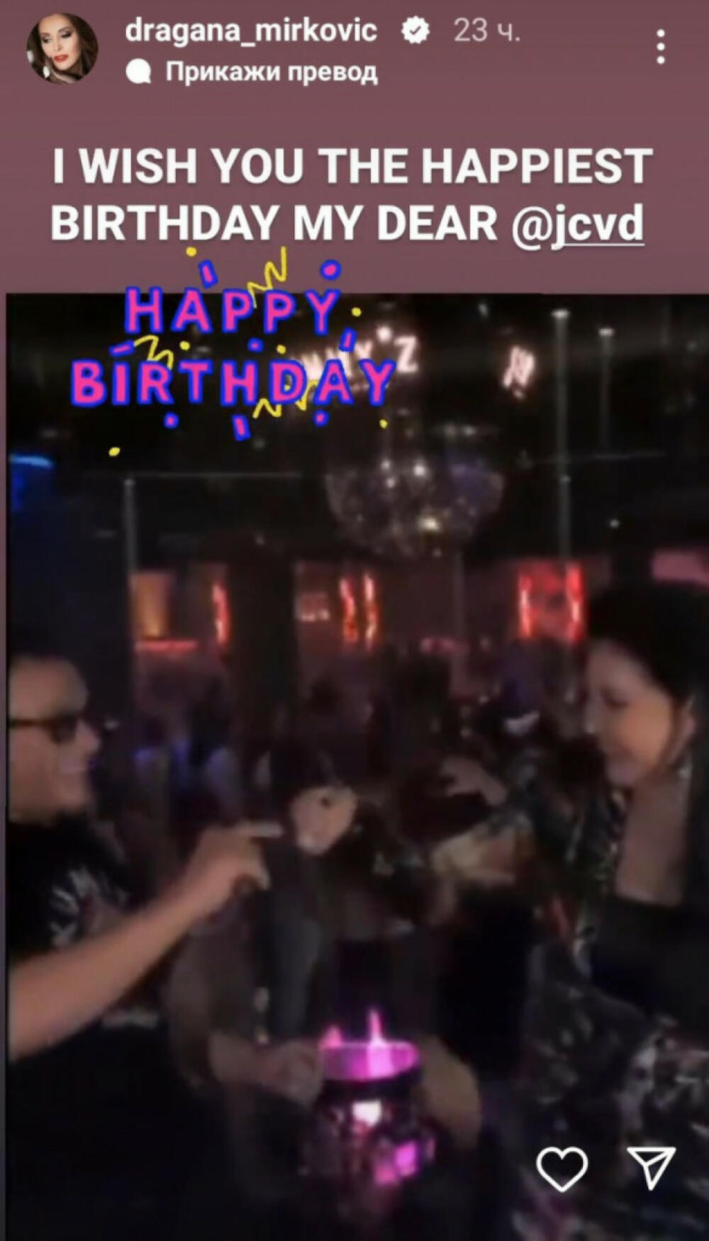 Dragana je nedavno na svom Instagram profilu podelila video zapis na kojem uživa u noćnom provodu i svetskim hitovima sa poznatim holivudskim glumcem Žan Klodom Van Damom, dok igraju uz poznate stihove. Ona je uz video objavu napisala i poseban opis čestitatjući 62. rođendan poznatom glumcu rečima: "Želim ti najsrećniji rođendan dragi moj." Dok su sa osmehom igrali i uživali u proslavi.