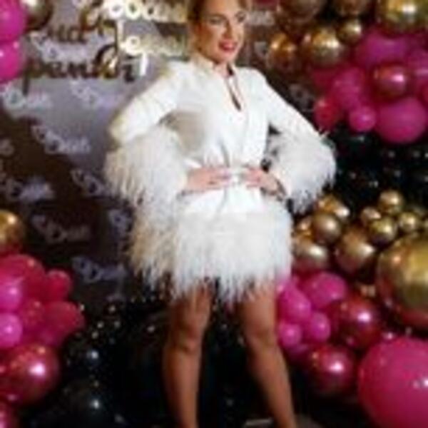 Na sebi je Jovana imala belu haljinu sa perjem, kosu je pokupila i stavila crveni karmin.