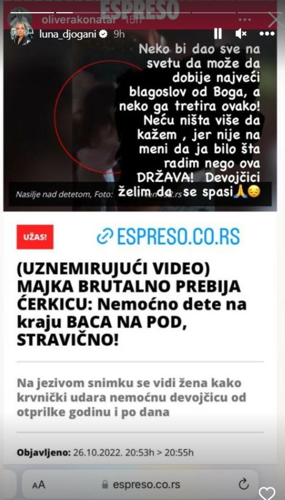 Ova scena potresla je i rijaliti zvezdu, Lunu Đogani, koja je trudna i uskoro će postati majka po drugi put, te se oglasila podelivši na stori tekst sa našeg portala uz opis:
