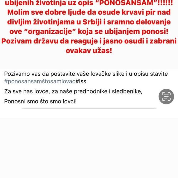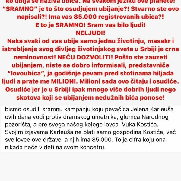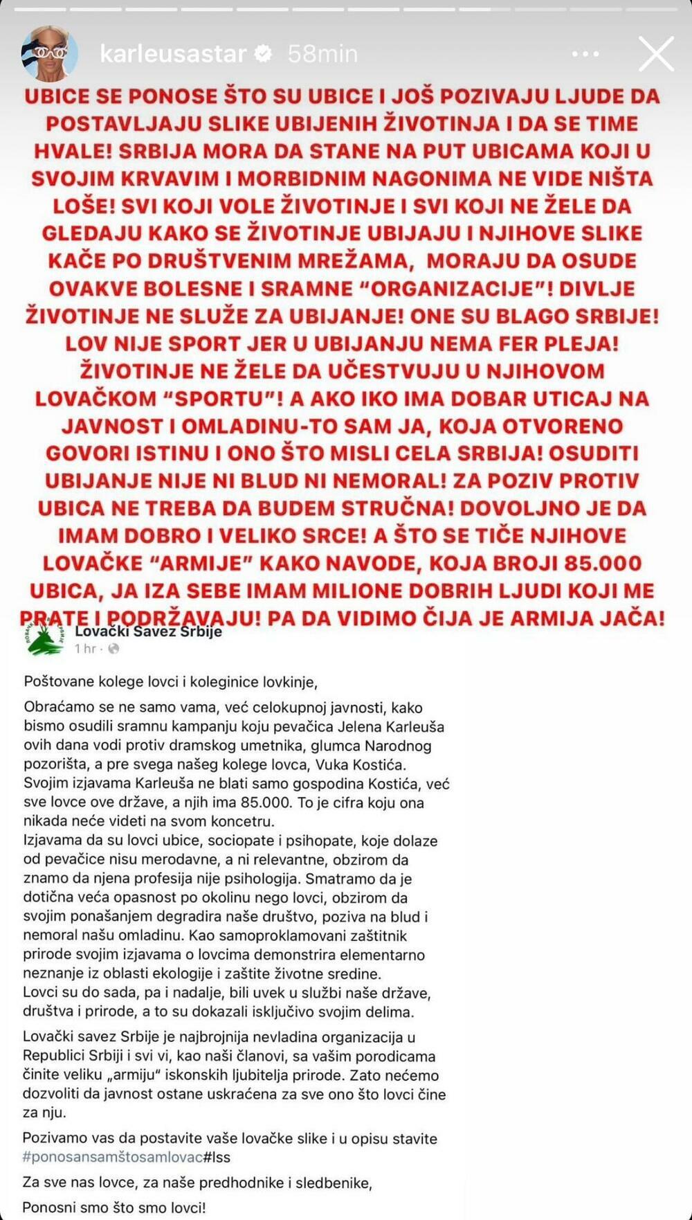 - Srbijo!!!!!!!! Građani Srbije!!!!! Dobri ljudi velikog srca i zdravog razuma!!!! Zaustavite ludačko ubijanje divljih životinja Srbije od strane lovačkog saveza Srbije!!!! Lov nije sport već ubijanje! U lovu nema fer pleja! Svako ko uživa u ubijanju je psihopata!!!! Divlje životinje Srbije su nacionalno prirodno blago i nalaze se pred istrebljenjem!!! Ovim tempom ubijanja, do 2030. godine, u Srbiji neće biti medveda, vukova, lisica, jelena, divljih svinja!!!!!!!! Lovački sramni savez lovaca je pozvao svojih 85.000 članova da ubijaju i objavljuju slike svojih žrtava uz opis "ponosan sam što sam lovac"! Srbijo, spreči masakr i istrebljenje!!! Jedna Instagram ili Fejsbuk slika mrtvog medveda ili jelena ili vuka ili lisice ili divlje svinje -nije vredna njihovog života! - završila je ogorčeno Karleuša.