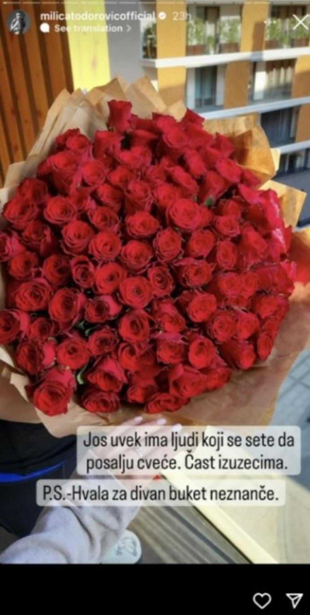 Naime, Milica Todorović se pohvalila pratiocima na Instagramu da joj je na kućnu adresu nepoznati momak poslao buket crvenih ruža.
