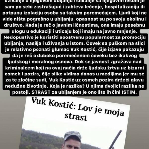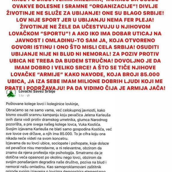 - Mogu da razumem da ljudi vole da jedu leševe životinja. Ljudi svašta jedu, pa i go*na (leš je ipak gori) i ja sam nekada jela meso jer sam bila debil (pa prestala). Mogu da razumem i da se koža ubijenih životinja zbog prehrane, umesto da se baci-koristi u industriji, za cipele i tašne (i ja imam puno kožnih tašni i cipela, auto mi ima kožna sedišta, itd. ali se trudim da pronalazim veštačke materijale), ali ubijanje divljih životinja iz zabave, za sliku????????? Molim???????? Hitno zabraniti lov na divlje životinje u Srbiji, jer su pred istrebljenjem!!!! Hitno! Ko je novi ministar za to pitanje? - napisala je Jelena.