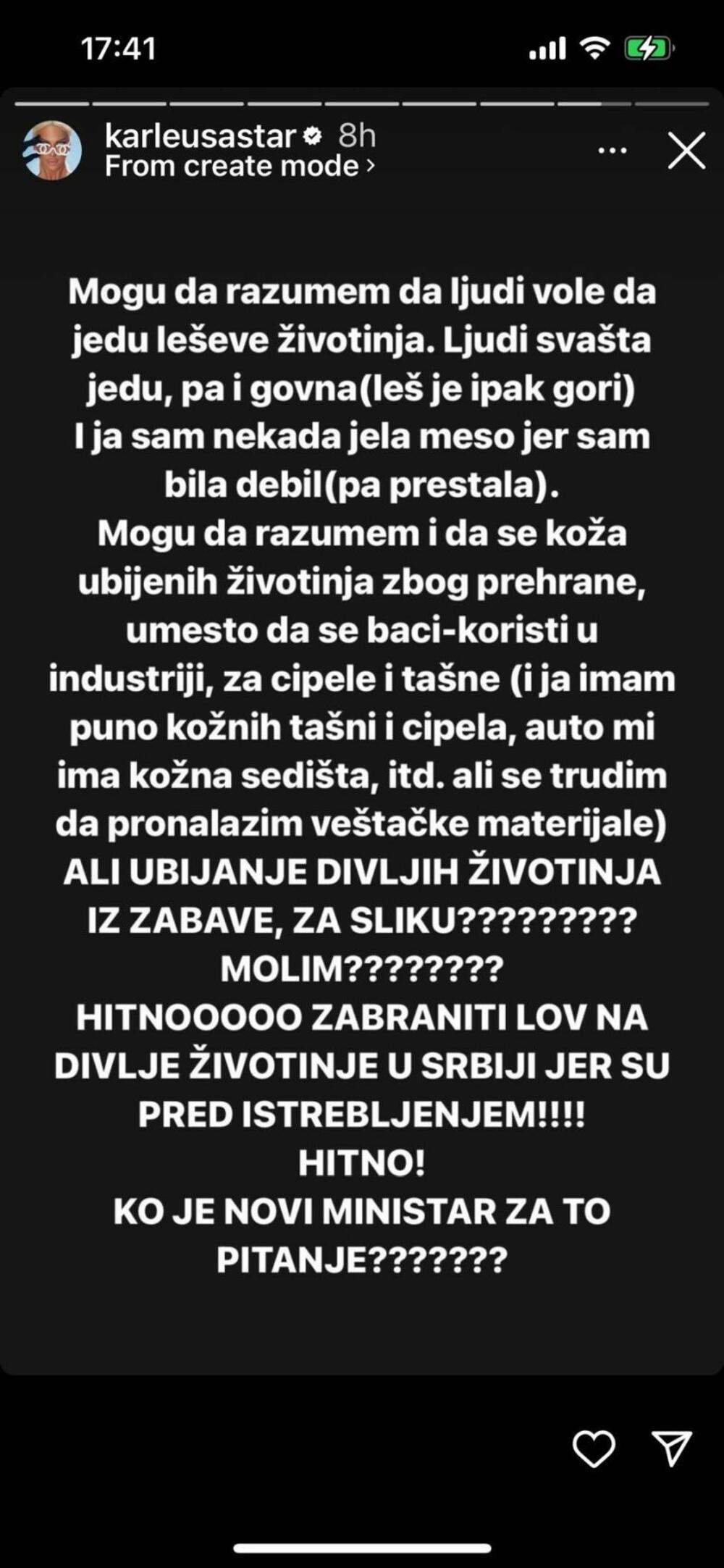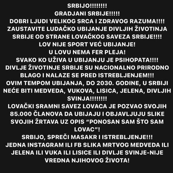 Karleuša je još jednom objavom u nizu odlučila i da se obrati državnim organima uz zahtev da se hitno donese zakon o zabrani lova u našoj zemlji.