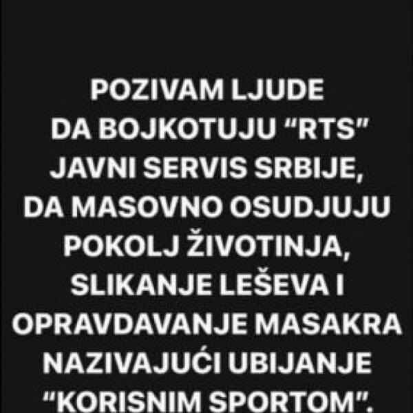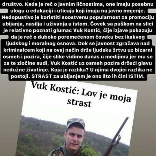 - Divlje životinje su pred izumiranjem u Srbiji! Jeleni, divlje svinje, medvedi, lisice, zečevi, fazani... Samo su neke od vrsta koje do 2030. godine više neće postojati zbog besomučnog ubijanja od strane neljudi koji sebe nazivaju “lovcima”, “prijateljima životinja” i “ljubiteljima prirode”! Lov nije sport kako to ubice životinja vole da naglase, jer sport je fer plej. U ubijanju nema ničega fer. Naprotiv! - napisala je muzička zvezda i dodala: