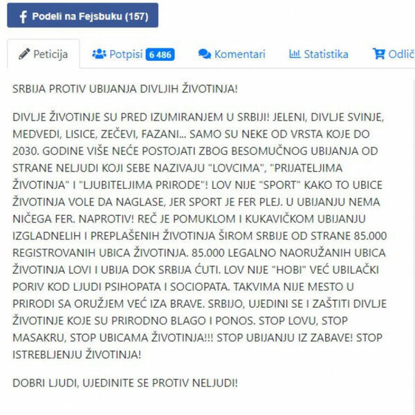 - Reč je o podmuklom i kukavičkom ubijanju izgladnelih i preplašenih životinja širom Srbije od strane 85.000 registrovanih ubica životinja. 85.000 legalno naoružanih ubica životinja lovi i ubija dok Srbija ćuti. Lov nije hobi, već ubilački poriv kod ljudi psihopata i sociopata. Takvima nije mesto u prirodi sa oružjem, već iza brave. Srbijo, ujedini se i zaštiti divlje životinje koje su prirodno blago i ponos. Stop lovu, stop masakru, stop ubicama životinja!!! Stop ubijanju iz zabave! Stop istrebljenju životinja! Dobri ljudi, ujedinite se protiv neljudi - stoji ispred njenog potpisa kao autora peticije.
