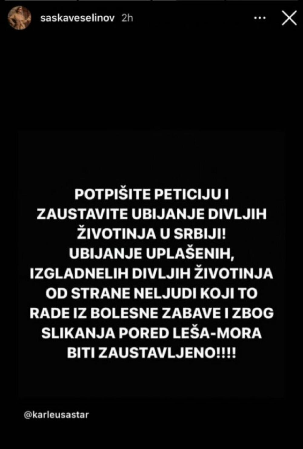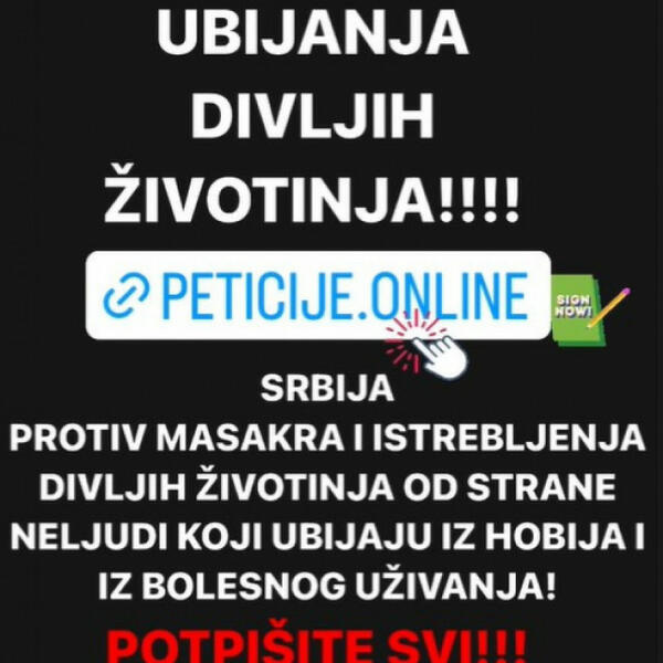 - Potpišite peticiju i zaustavite ubijanje divljih životinja u Srbiji! Ubijanje uplašenih, izgladnelih, divljih životinja od strane neljudi koji to rade iz bolesne zabave i zbog slikanja pored leša- mora biti zaustavljeno!!!- napisala je Saška.