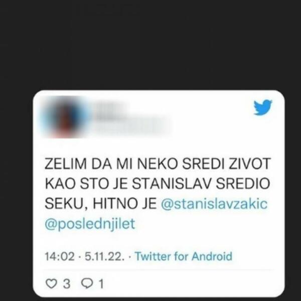 „Želim da mi neko sredi život kao što je Stanislav Zekić sredio Seku, hitno je“, stoji u objavi koja se očigledno toliko dopala pevačici da je odmah podelila na svom nalogu.