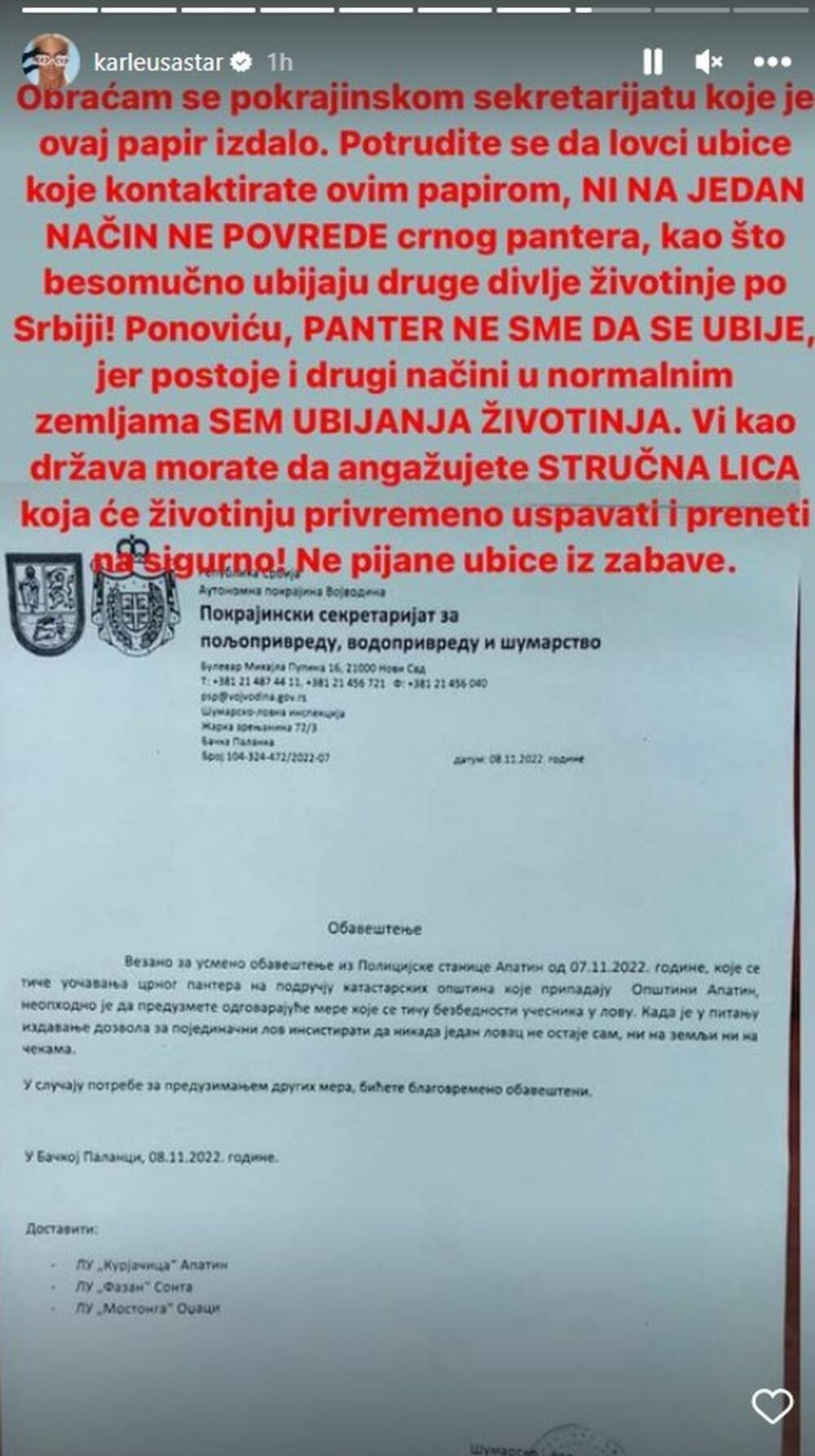 - Obraćam se pokrajinskom sekretarijatu koje je ovaj papir izdalo. Potrudite se da lovci ubice koje kontaktirate ovim papirom, ni na jedan način ne povrede crnog pantera, kao što besomučno ubijaju druge divlje životinje po Srbiji! Ponoviću, PANTER NE SME DA SE UBIJE, jer postoje i drugi načini u normalnim zemljama sem ubijanje životinja. Vi kao država morate da angažujete stručna lica koja ce životinju privremeno uspavati i preneti na sigurno! Ne pijane ubice iz zabave - napisala je ona i dodala: