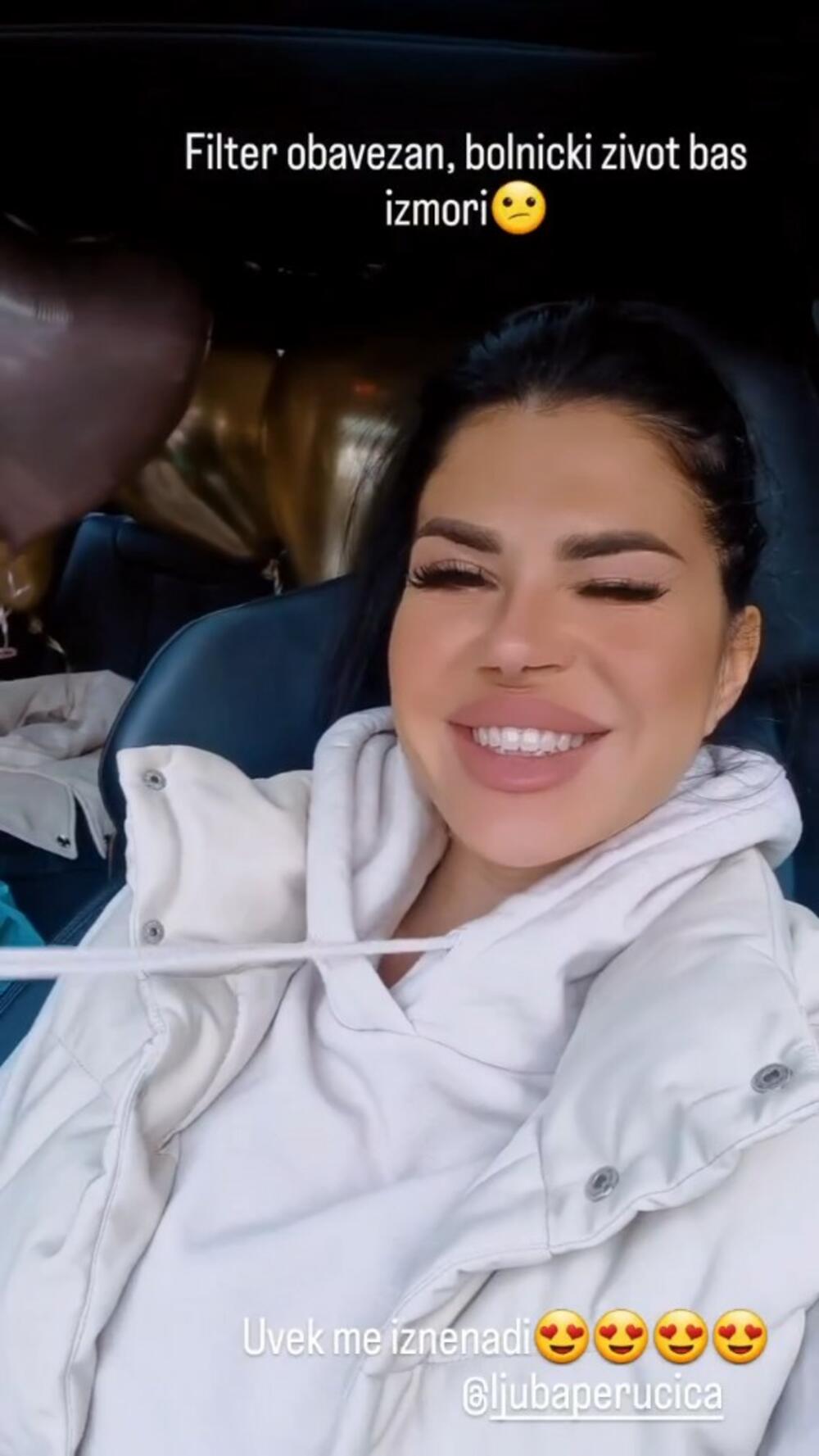 – Filter obavezan, bolnički život baš izmori - navela je Katarina uz objavljeni snimak na "Instagramu", ali je u nastakvu dodala da ju je Ljuba Perućica iznenadio i snimila je poklone na zadnjem sedištu auta.