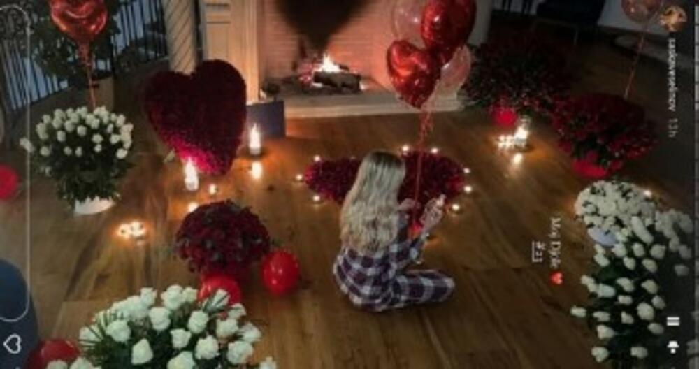 Dnevnu sobu je ukrasio buketima crvenih i belih ruža, a svuda okolo su bile upaljenje ukrasne sveće, kao i baloni u obliku srca.