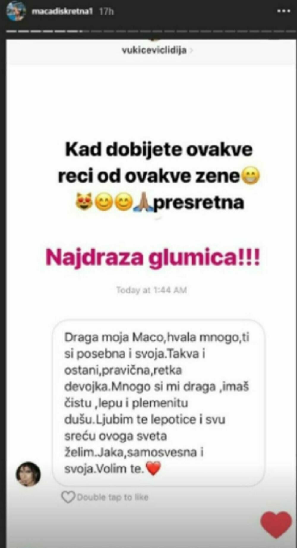 Naime, Maca je tada na svom Instagram profilu podelila privatnu poruku podrške, koju je navodno dobila od glumice Lidije Vukićević, a ta poruka se još uvek prepičava.