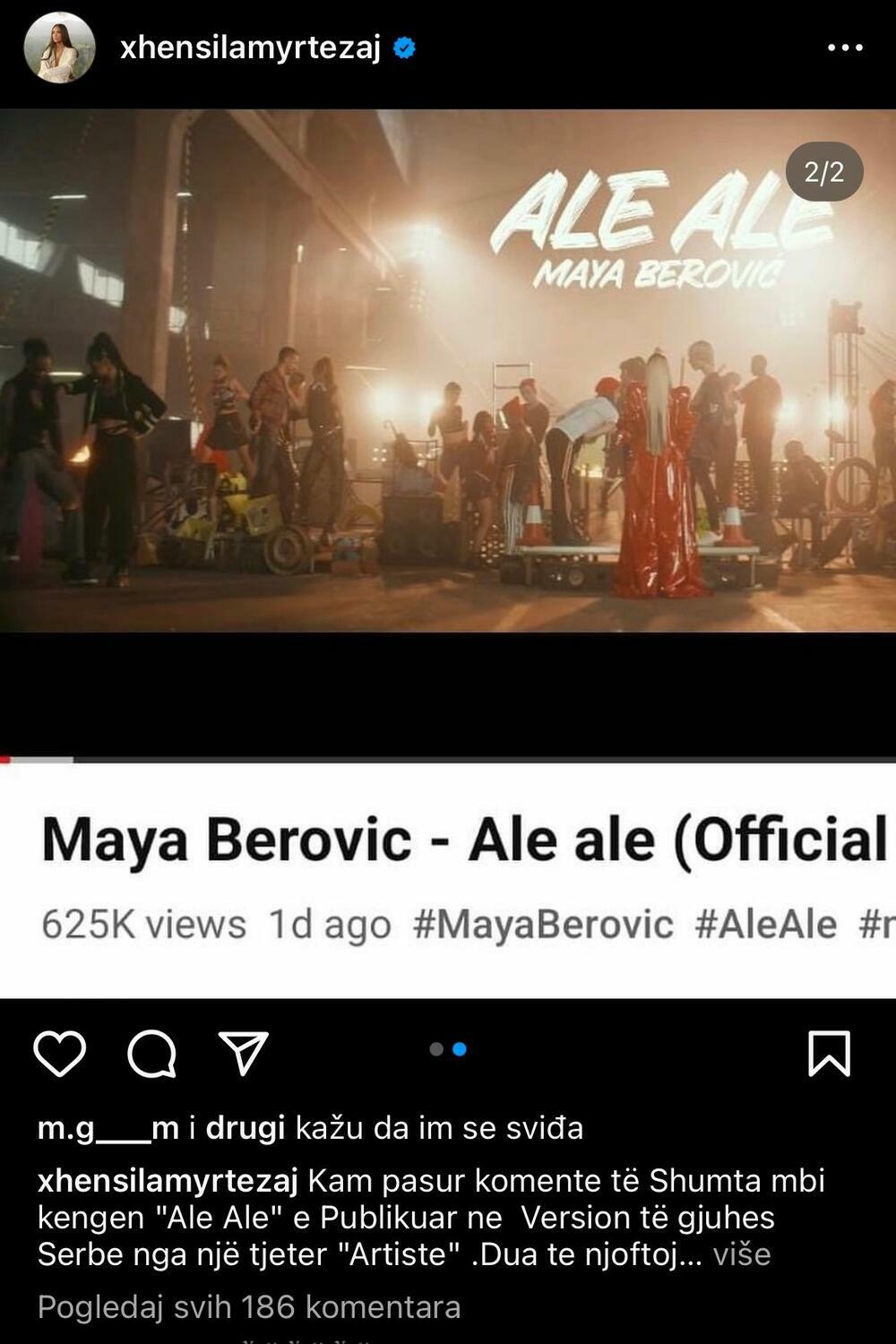 - Imala sam mnogo komentara na pesmu "Ale, ale", koju je u srpskoj verziji objavio drugi "umetnik" (pevač, prim. aut.). Obaveštavam javnost i svoje pratioce da nemam nikakva autorska prava nad ovom pesmom, osim onlajn korišćenja projekta moje objavljene verzije! Pesmu nisam ja prodala i nisam bila svesna ove činjenice! P. S. Da se ja ili moja produkcija pitamo, Srbija ili srpski umetnik bi bio na dnu liste da im se proda pesma - završila je svoj komentar Džensila, koja je objavila i skrinšot iz Majinog spota, zbog čega je dobila mnoštvo pozitivnih komentara svojih pratilaca.