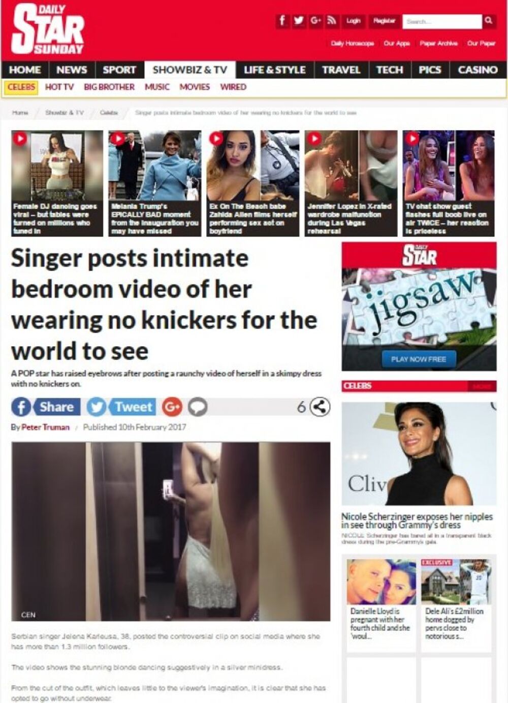"Srpska pevačica Jelena Karleuša (38) objavila je kontroverzni snimak na kojem sugestivno pleše obučena u mini haljinu", piše Dejli Star.