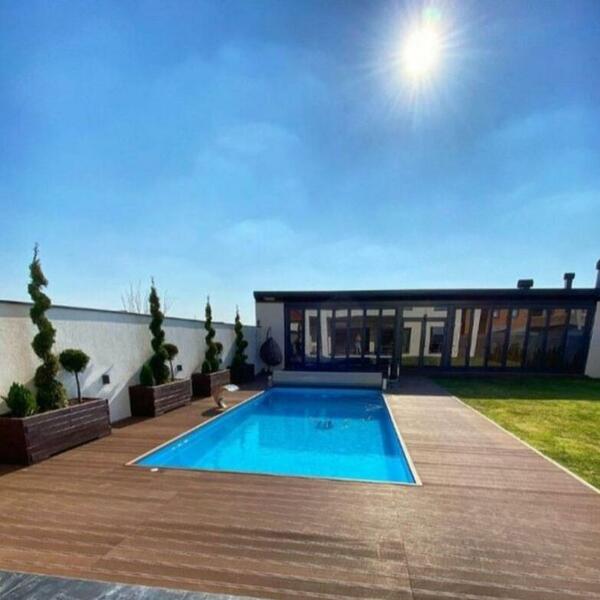 Ravnih i modernih linija, vila se lepo uklapa u prostrano dvorište u kojem dominiraju bazen i brižljivo negovan travnjak.