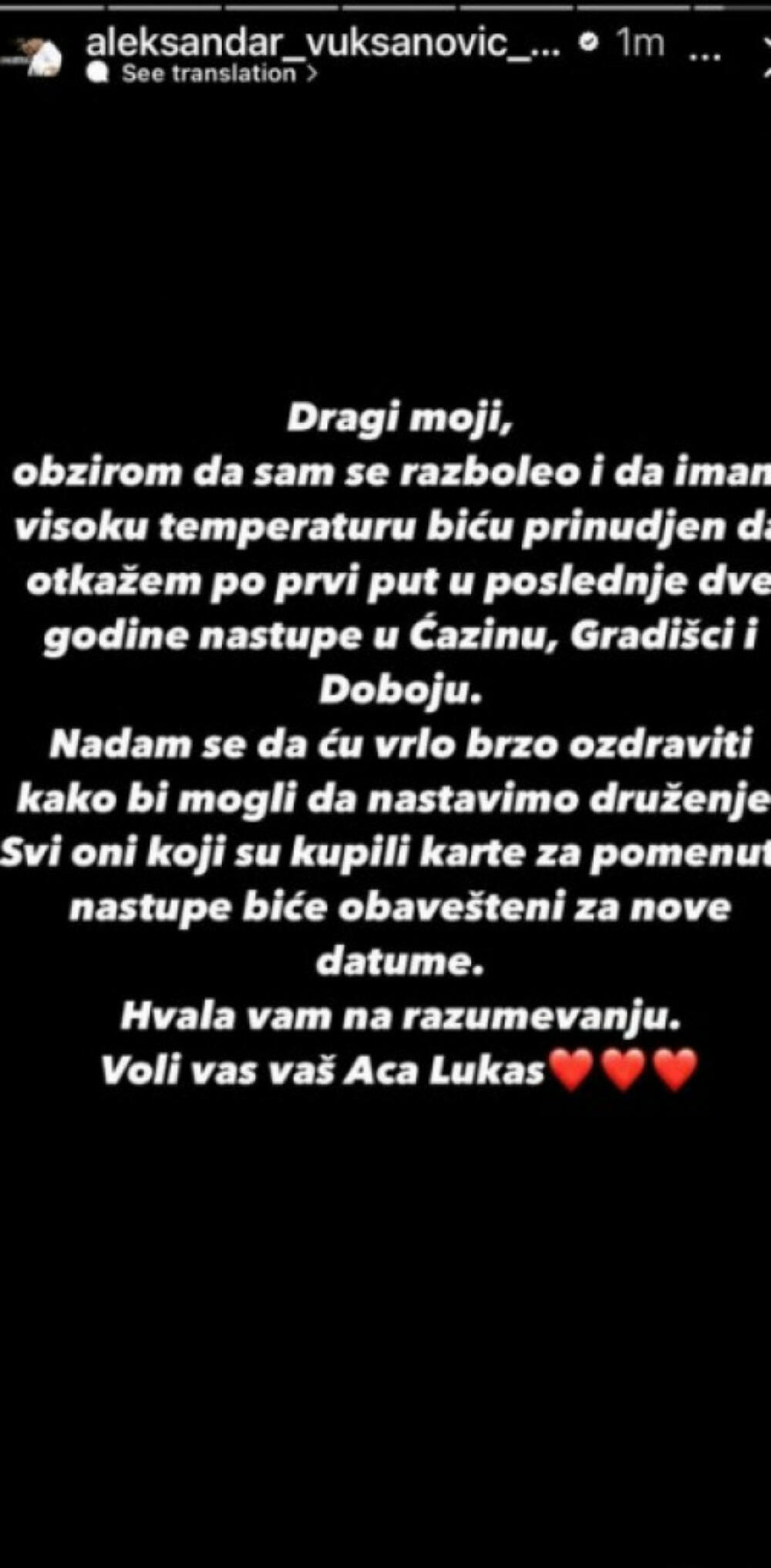 - Nadam se da ću brzo ozdraviti kako bi mogli da nastavimo druženje! Svi oni koji su kupili karte za pomenute nastupe biće obavešteni za nove datume. Hvala na razumevanju. Voli vas vaš Aca Lukas.