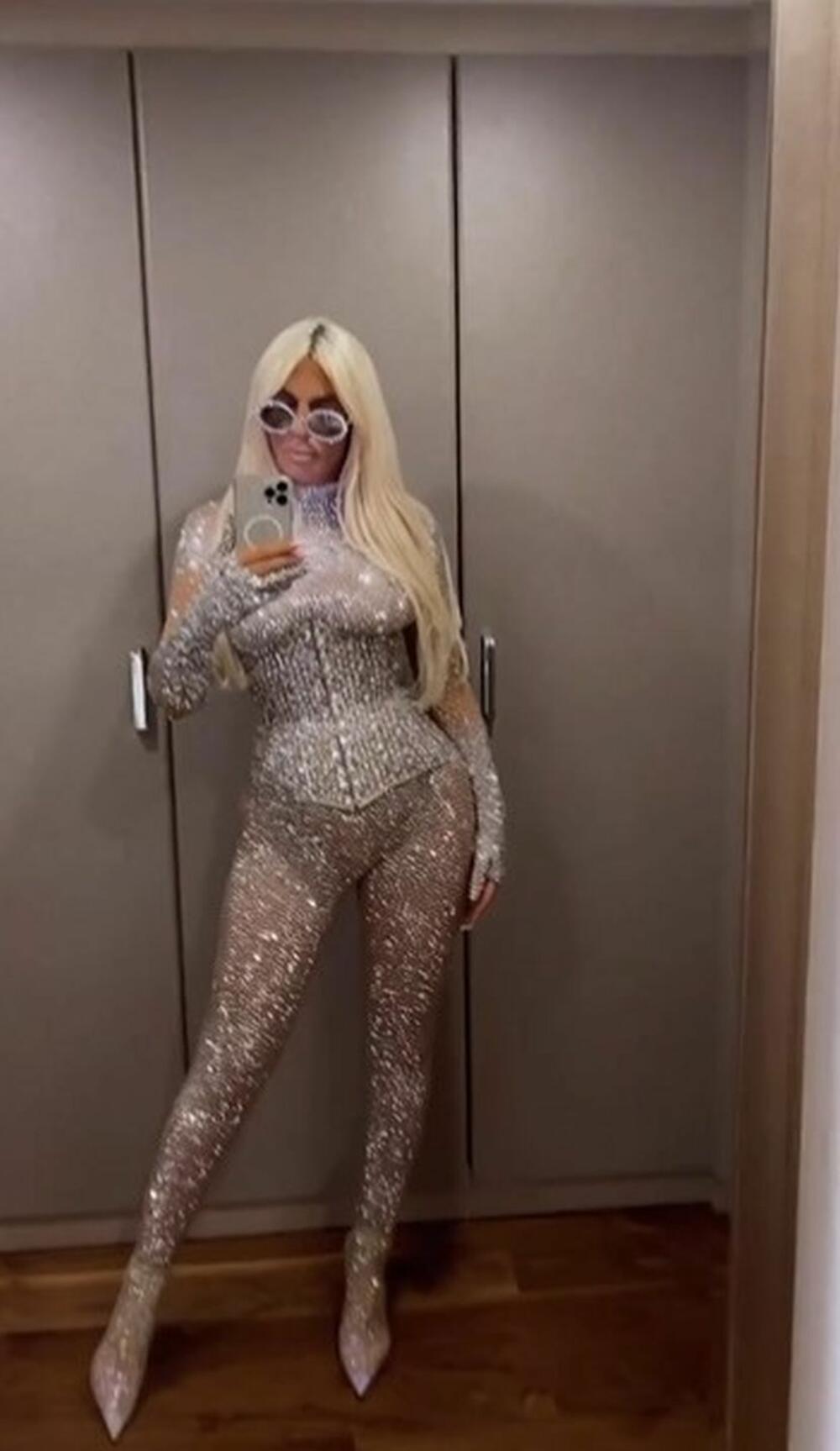 Jelena je na sebe navukla skupoceni kombinezon koji je isticao njene bujne atribute, a struk posebno naglasila steznikom koji je takođe bio ukrašen sitnim kristalima.