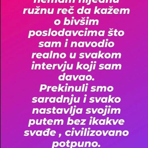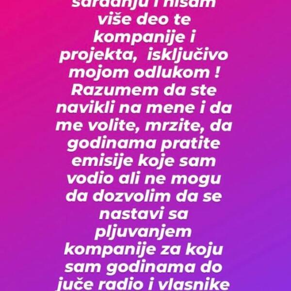 - Sa Televizijom Pink i Zadrugom sam završio poslovnu saradnju i nisam više deo te kompanije i projekta, isključivo mojom odlukom! Razumem da ste navikli na mene i da me volite, mrzite, da godinama pratite emisije koje sam vodio, ali ne mogu da dozvolim da se nastavi sa pljuvanjem kompanije za koju sam godinama do juče radio i vlasnike iste jer da meni nisu bili dobri ne bih toliko vremena bio sa njima i sarađivao na tako dobar način - napisao je voditelj u svom statusu.