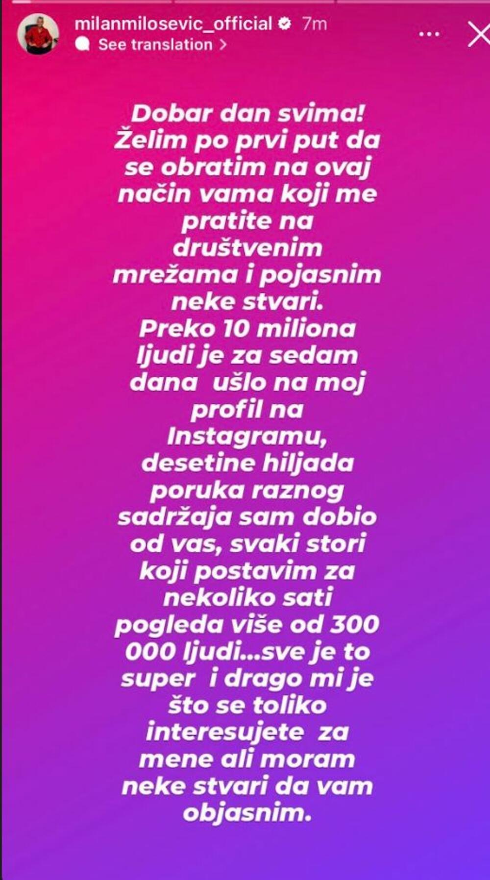 - Dobar dan svima! Želim po prvi put da se obratim na ovaj način vama koji me pratite na društvenim mrežama i pojasnim neke stvari. Preko 10 miliona ljudi je za sedam dana ušlo na moj profil na Instagramu, desetine hiljade poruka raznog sadržaja sam dobio od vas, svaki stori koji postavim za nekoliko sati pogleda više od 300.000 ljudi. Sve je to super, drago mi je što se toliko interstujete za mene ali moram neke stvari da vam objasnim - napisao je Milan.