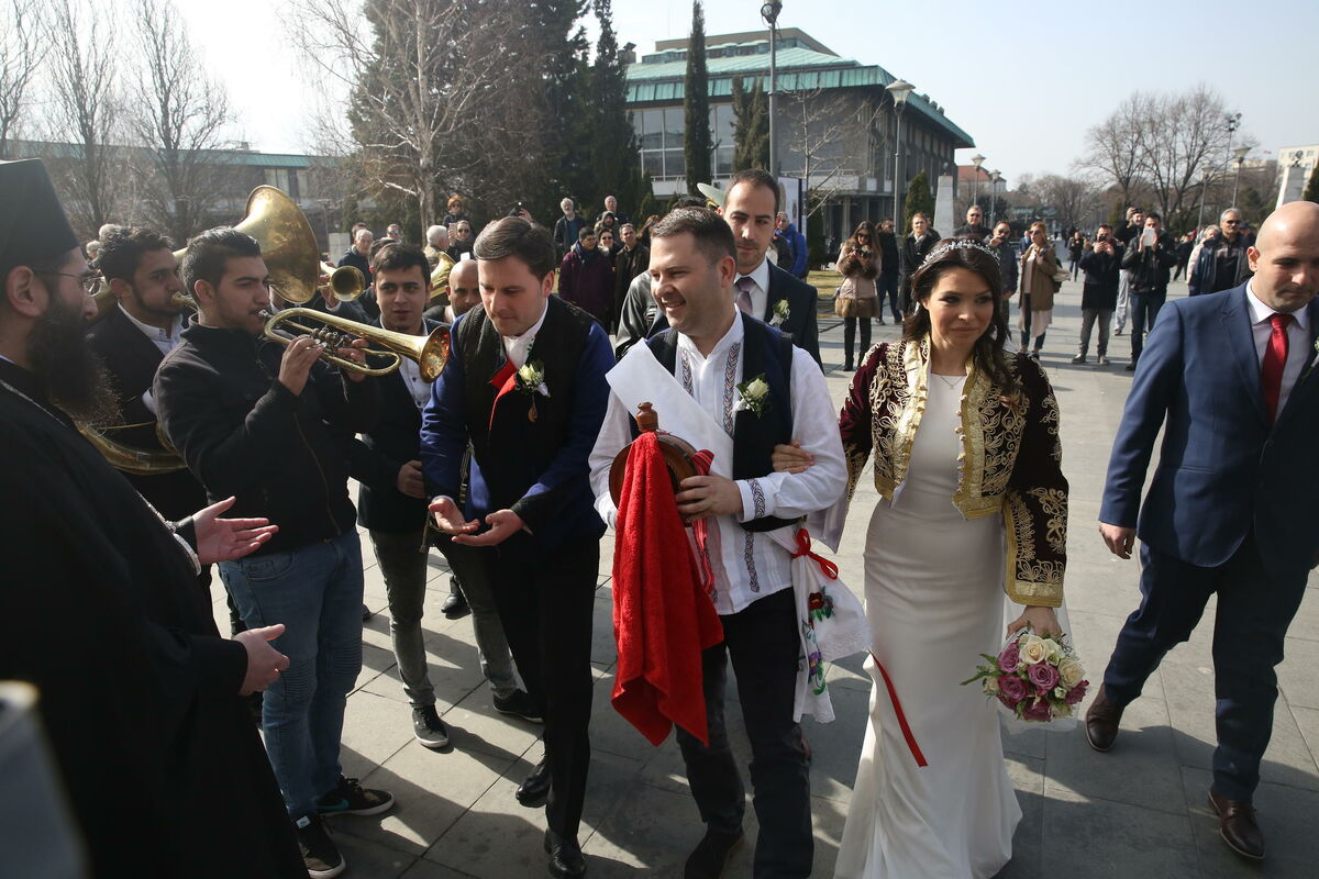 Mladence je venčao poglavar SPC patrijarh Irinej, a ispred Hrama svatove su dočekali trubači.