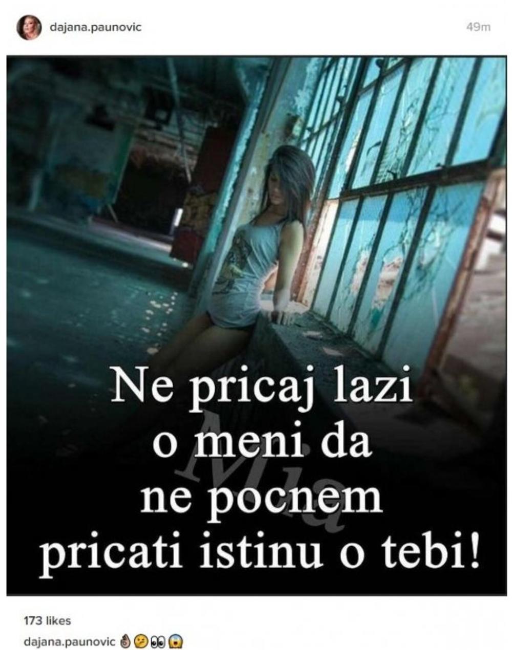 - Ne pričaj laži o meni, da ne počnem ja da pričam istinu o tebi - stoji na posteru koji je Dajana podelila na svom Instagramu, ali nije poznato na koga je mislila.