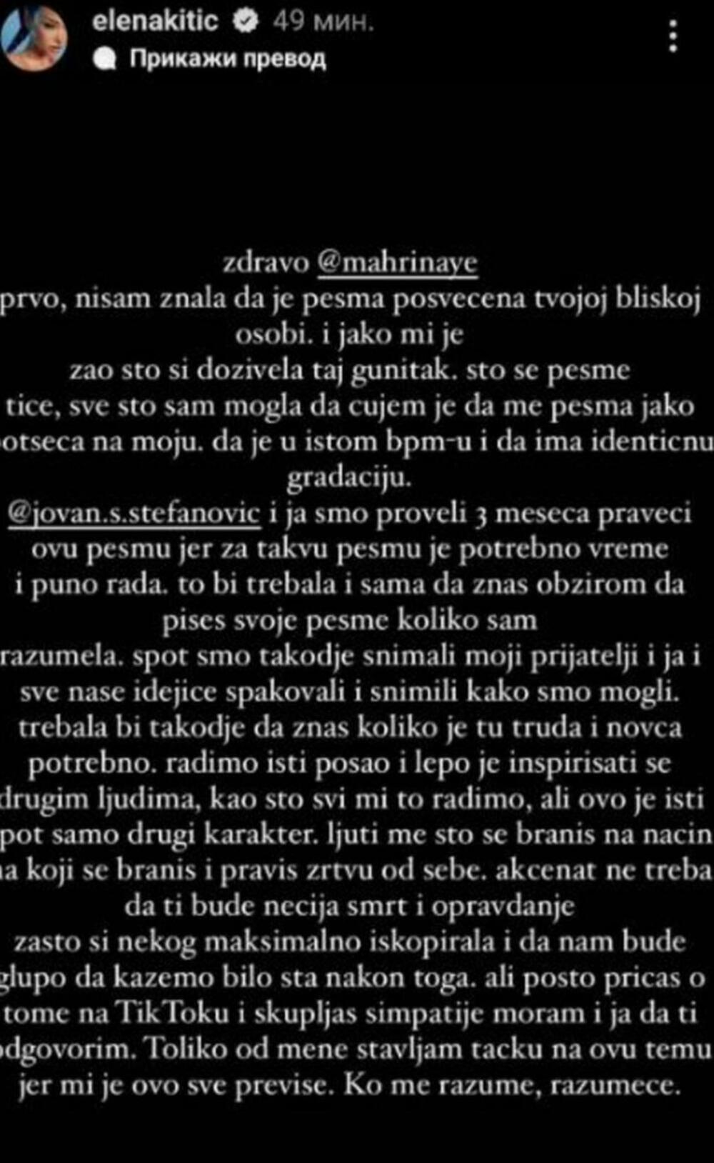 Radimo isti posao i lepo je inspirisati se drugim ljudima, kao što svi mi radimo, ali ovo je isti spot samo drugi karakter, ljuti me što se braniš na način na koji se braniš i praviš žrtvu od sebe, akcenat ne treba da ti bude nečija smrt i opravdanje zašto si nekoga maksimalno iskopirala i da nam bude glupo da kažemo bilo šta nakon toga. Pošto pričaš na Tiktoku i skupljaš simpatije moram i ja da ti odgovorim. Toliko od mene stavljam tačku na ovu temu jer mi je ovo sve previše. Ko me razume, razumeće - napisala je Elena na šta joj je Mahrina odmah odgovorila:
